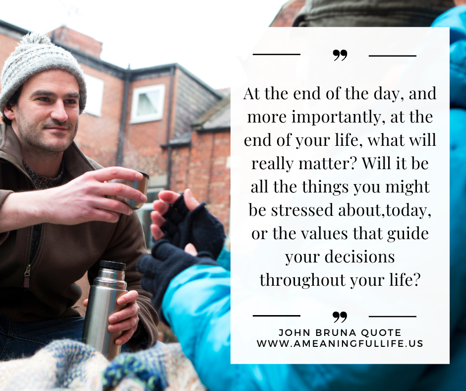 Today’s Quote: “At the end of the day, and more importantly, at the end of your life, what will really matter? Will it be all the things you might be stressed about,today, or the values that guide your decisions throughout your life?” – John Bruna